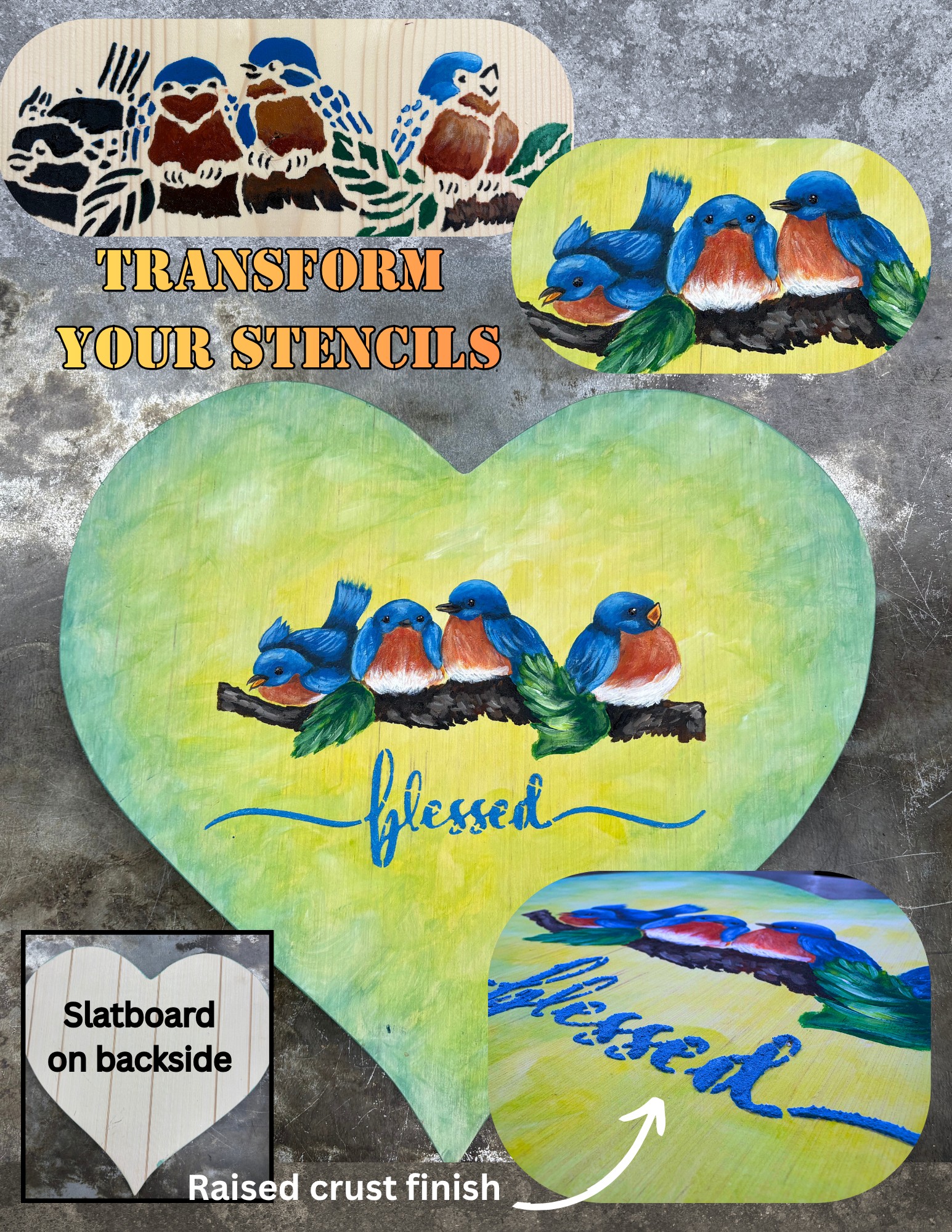 • Painting on canvas, sign making with stencils, wooden trays, and more