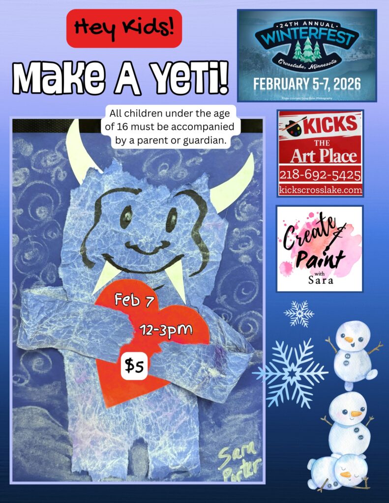 Join us at Up North Social in Crosslake for this special paint and sip of “Cozy Highland.” Enjoy the vibe and sip some wine while painting along, step by step. Instructor, Sara Porter, will have your canvas prepped with an outline of the muzzle and scarf, so pre-registration is a must to ensure we have a canvas prepped and ready for you. All materials are provided, including aprons, just as if you were coming to paint in our studio at Kicks. “Cozy Highland” is a beginner level painting, meaning anyone can join us, no experience necessary. Come to have fun and you might be surprised at what you can do with the right tools and guidance. $52 acrylic paint 12×16 canvas